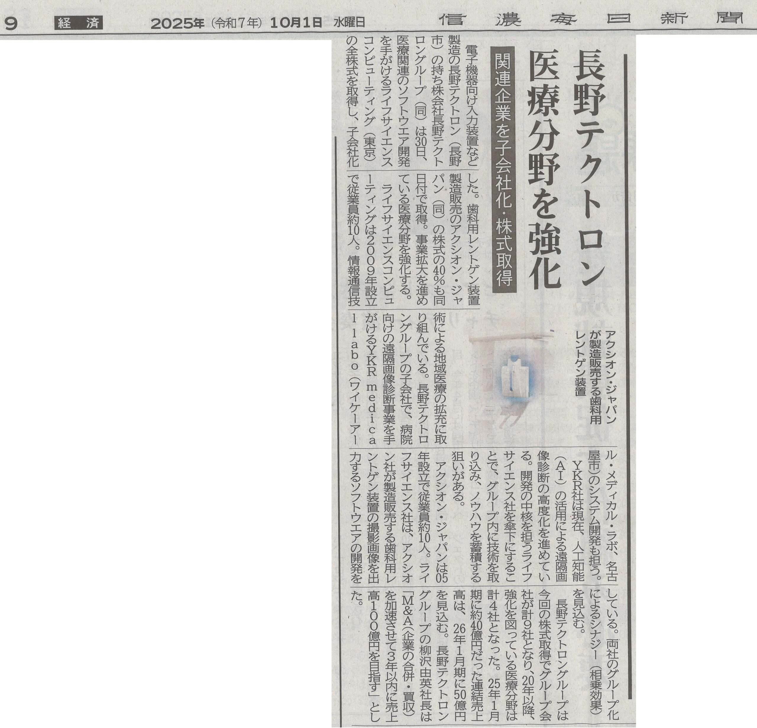 2025年10月1日付で、株式会社アクシオン・ジャパンが長野テクトロングループに加入いたしましたので、お知らせいたします。